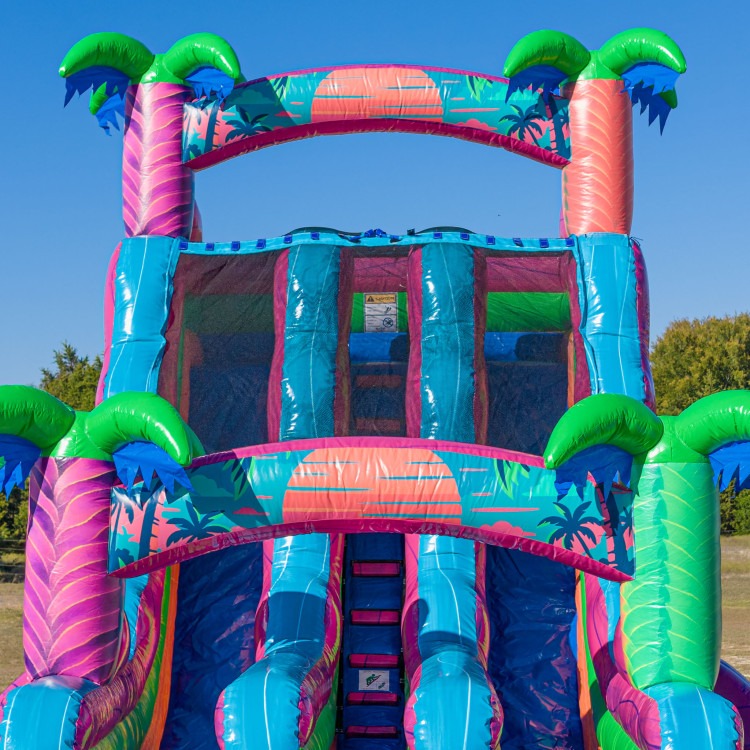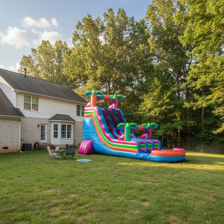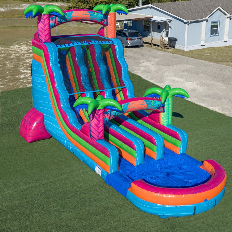 The bold tropical colors feel fun and modern, making it a great fit for birthdays, backyard parties, school events, and summer celebrations. This water slide is sturdy, exciting, and a favorite for kids who want something fast and fun.